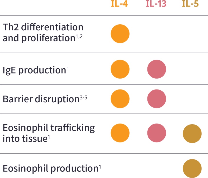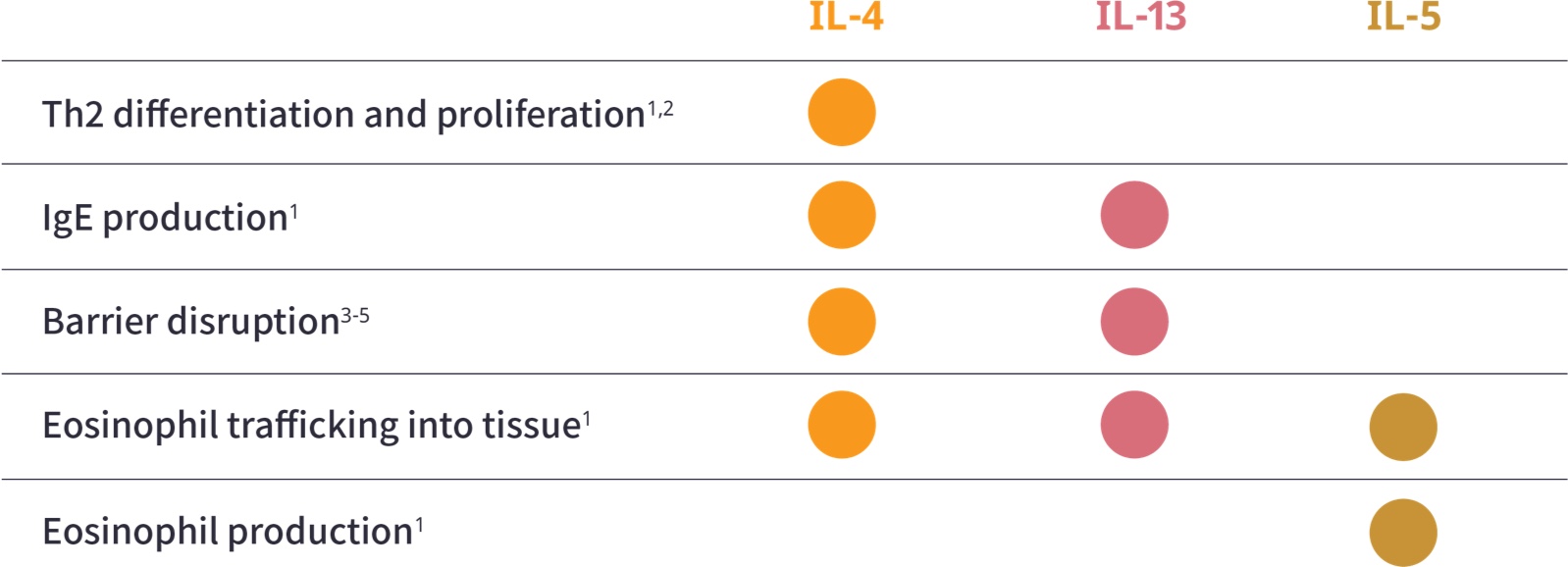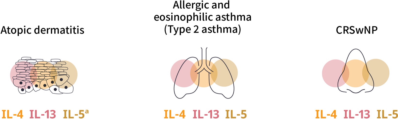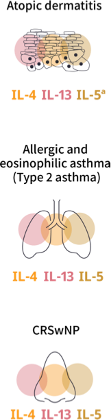 The IL-4, IL-13, and IL-5 cytokine pathways act specifically within the Type 2 inflammatory cascade.1,2 One or more of these signaling pathways contribute to disease-specific effects or to inflammatory effects found across different diseases.1